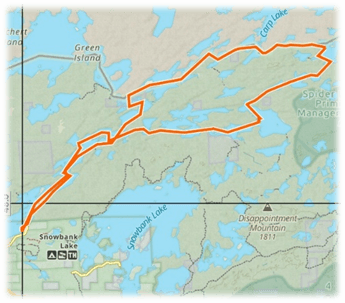 The South Platoon put in further east at Moose Lake and paddled northeast to Newfound Lake. From there they continued northeast to Sucker Lake and into international waters at Birch Lake. After portaging to Carp Lake, they paddled east to Melon Lake, portaged to Seed Lake, continued east and portaged again to Knife Lake where they set up their first camp.