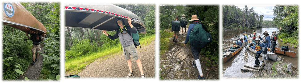 Portaging consisted of carrying a Duluth pack weighing up to 80 lb of gear, one on the back and another on the front. Portaging the canoe was done by one individual carrying the 20-ft long canoe inverted on their shoulders. Sometimes the trails were steep and rugged, increasing the challenge. Once back at a lake, the canoes were reloaded and off again.