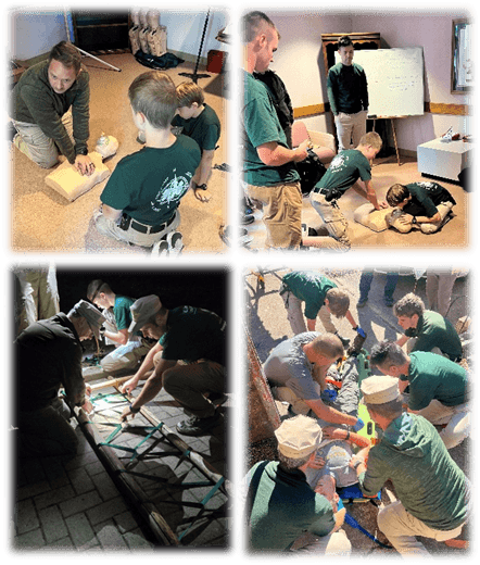 Father-son time each day enabled one-on-one discussion of lessons learned to be processed and internalized. As part of the emergency field first aid training, adult and infant mannequins were used enabling each person to practice and refine their CPR and AED skills.  Warrant Officer Joshua Waddell, a father, US Army Major, pilot, and experienced EMT provided top-notch medical training using the ALERT Cadet Wilderness/Remote First Aid Manual recently updated by Captain Mark Fields from Pennsylvania.