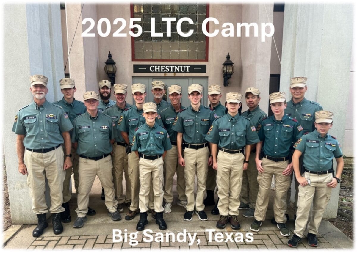 On October 27, 2025, five fathers and seven sons joined with four Cadre members to form a Company of 16 strong at the International ALERT Academy in Big Sandy, Texas.  The Company, composed of the Cadre and Platoon came from Texas, Oklahoma, California, South Carolina, New Hampshire and Maine.  The Platoon of fathers and sons was divided into two Squads, each with six members.